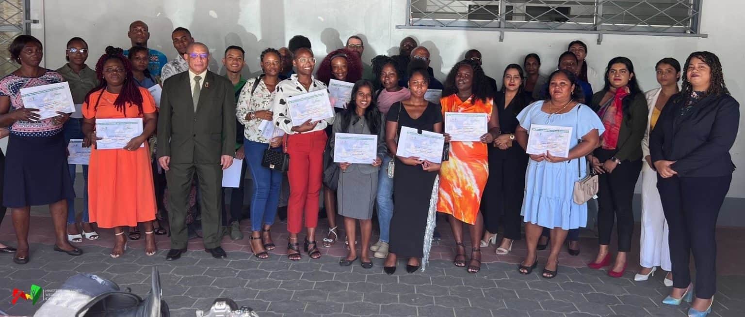 De uitreiking vond plaats in aanwezigheid van minister Steven Mac Andrew van Arbeid, Werkgelegenheid & Jeugdzaken (AWJ). De trainingen maken deel uit van het project “Labour Market Alignment with New Industries”, dat wordt gefinancierd door een lening van de Inter-American Development Bank (IADB).