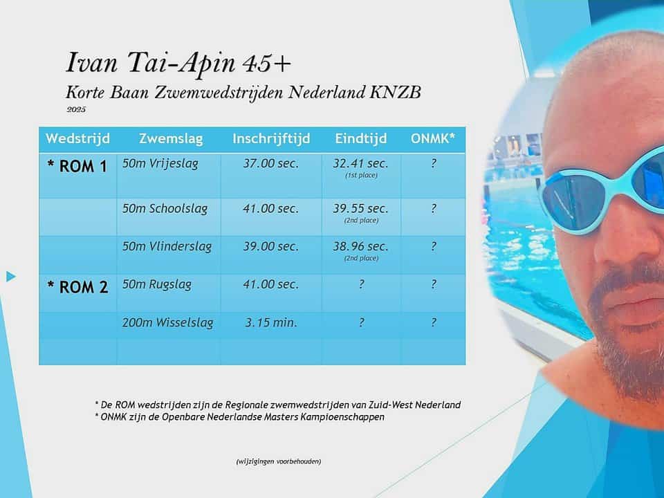 Ivan Tai-A Pin heeft op de 50m schoolslag en 50m vlinderslag de tweede plek behaald in de leeftijdscategorie 45+ tijdens de ROM1 regionale masters zwemwedstrijden in Zwijndrecht, Nederland.