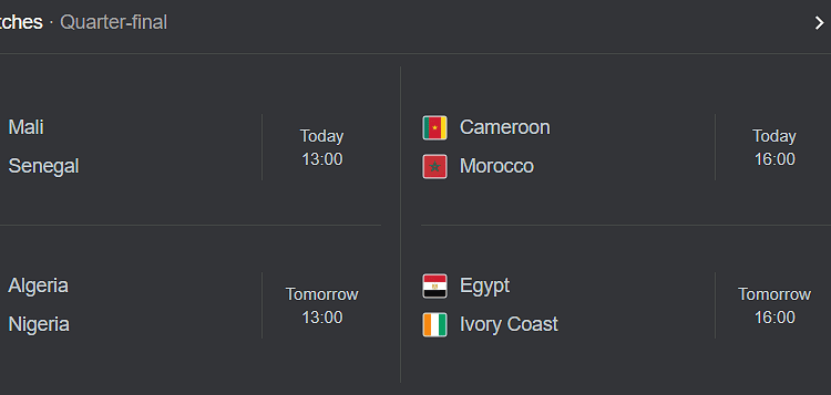- Vrijdag 9 januari 13:00: Mali – Senegal (Ibn Batouta Stadium, Tanger)