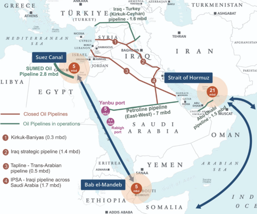 Landen in de regio beschikken wel over alternatieve routes, maar die zijn beperkt. Saudi-Arabië kan via de East-West-pijpleiding olie naar de Rode Zeehaven Yanbu vervoeren. De Verenigde Arabische Emiraten gebruiken de Habshan-Fujairah-pijpleiding, die buiten Hormuz uitkomt aan de Golf van Oman. Ook Irak beschikt via Turkije over een noordelijke exportroute.