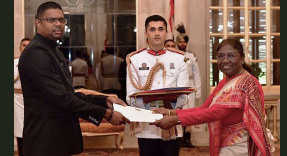 De Buitengewoon- en gevolmachtigd ambassadeur van de Republiek Suriname voor India, Arunkoemar Hardien, heeft op vrijdag 26 augustus zijn geloofsbrieven aangeboden aan de president van India, Droupadi Murmu. De ceremoniële plechtigheid vond plaats op het Indiase presidentieel paleis de Rashtrapati Bhawan.