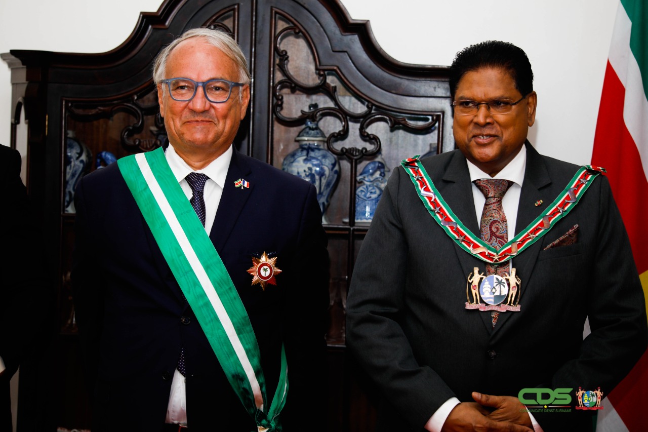 “I am proud of this medal of Suriname”, zei ambassadeur Antoine Joly dinsdag op het presidentieel paleis. Hij is benoemd tot Drager van het Grootlint in de Ere-Orde van de Palm, als erkenning voor zijn werk en onbegrensde pogingen om de landen dichterbij elkaar te brengen. Na een periode van vijf jaar vertrekt de diplomaat uit Suriname. President Chandrikapersad Santokhi sprak van een bitterzoet moment. Hij vindt dat met het vertrek van Joly, een goede vriend en “wan brada fu Sranan” vertrekt. Hij memoreerde ook de bijdrage van ambassadeur Joly in het versterken van de bilaterale relaties tussen de Republiek Suriname en de Franse republiek.
