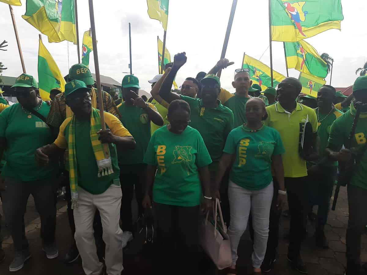 Het ontbrak de BEP niet van enthousiasme. Onder muzikale begeleiding maakte de partij haar aanwezigheid kenbaar, ondersteund door partijleden en vlaggendragers. “Wi ey go, gi a kenki. Decentralisatie is centraal. Lang leve de BEP,” werd gescandeerd door de partij. “Deze regering moet weg” wordt er ook aangegeven door de partijleden.