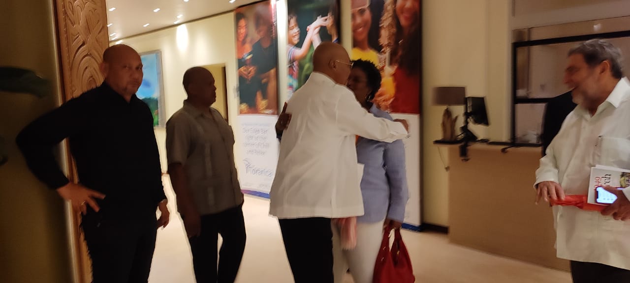 In de lobby van Torarica nam Bouterse vriendschappelijk afscheid van de Barbadiaanse prime minister Mia Motley en prime minister Ralph Gonsalves van Sint Vincent and the Grenadines. Bouterse heeft kort aangegeven dat er globaal is gesproken over de stand van zaken in de wereld.