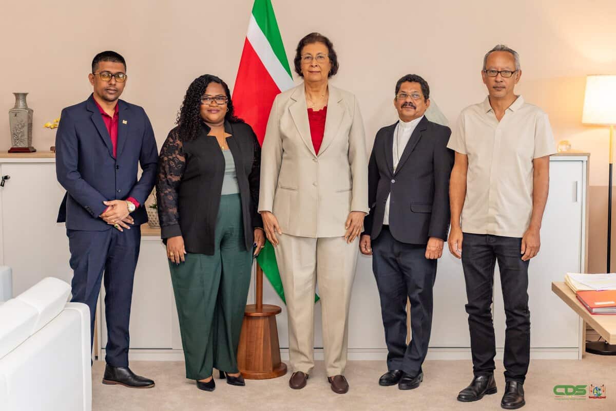 President Jennifer Simons en bisschop Karel Choennie van de Rooms-Katholieke Kerk hebben dinsdag 14 april 2026 gesproken over het behoud van monumentaal erfgoed in de Surinaamse binnenstad. Tijdens het onderhoud kwamen onder meer de restauratie van het Poortgebouw aan de Monseigneur Wulfinghstraat en de bredere staat van historische panden in Paramaribo aan de orde.