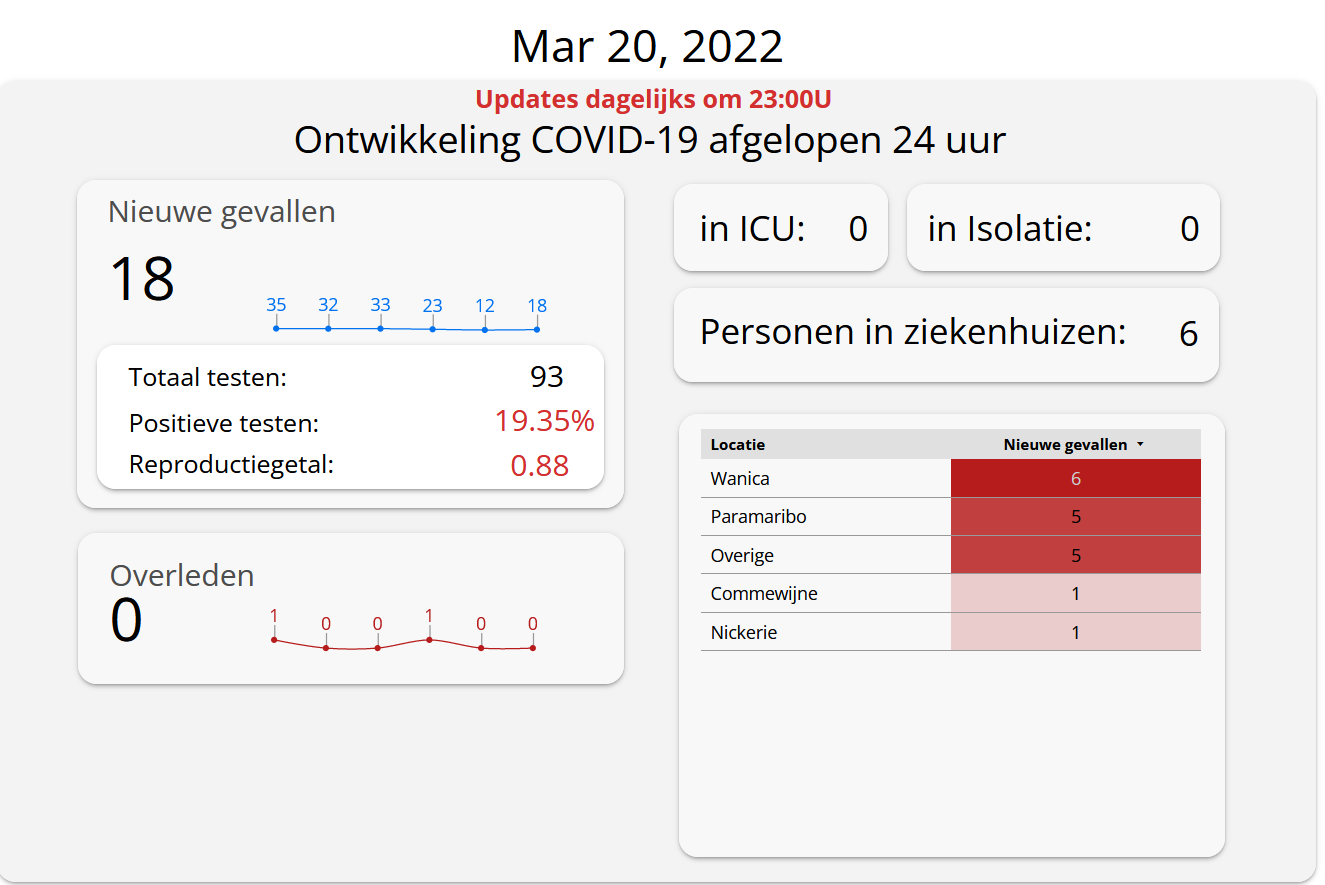 Van de 93 swabs die in de afgelopen 24 uur zijn afgenomen is 19,35% positief getest. Dit komt neer op 18 personen die Covid-19 positief zijn. Het reproductiegetal is hierdoor op 0.88 gebracht. Zes personen zijn opgenomen in het ziekenhuis.Van hen zijn vier volledig gevaccineerd, van een is de status onbekend. Een persoon is niet gevaccineerd staat aangegeven op het covid-19 dashboard.