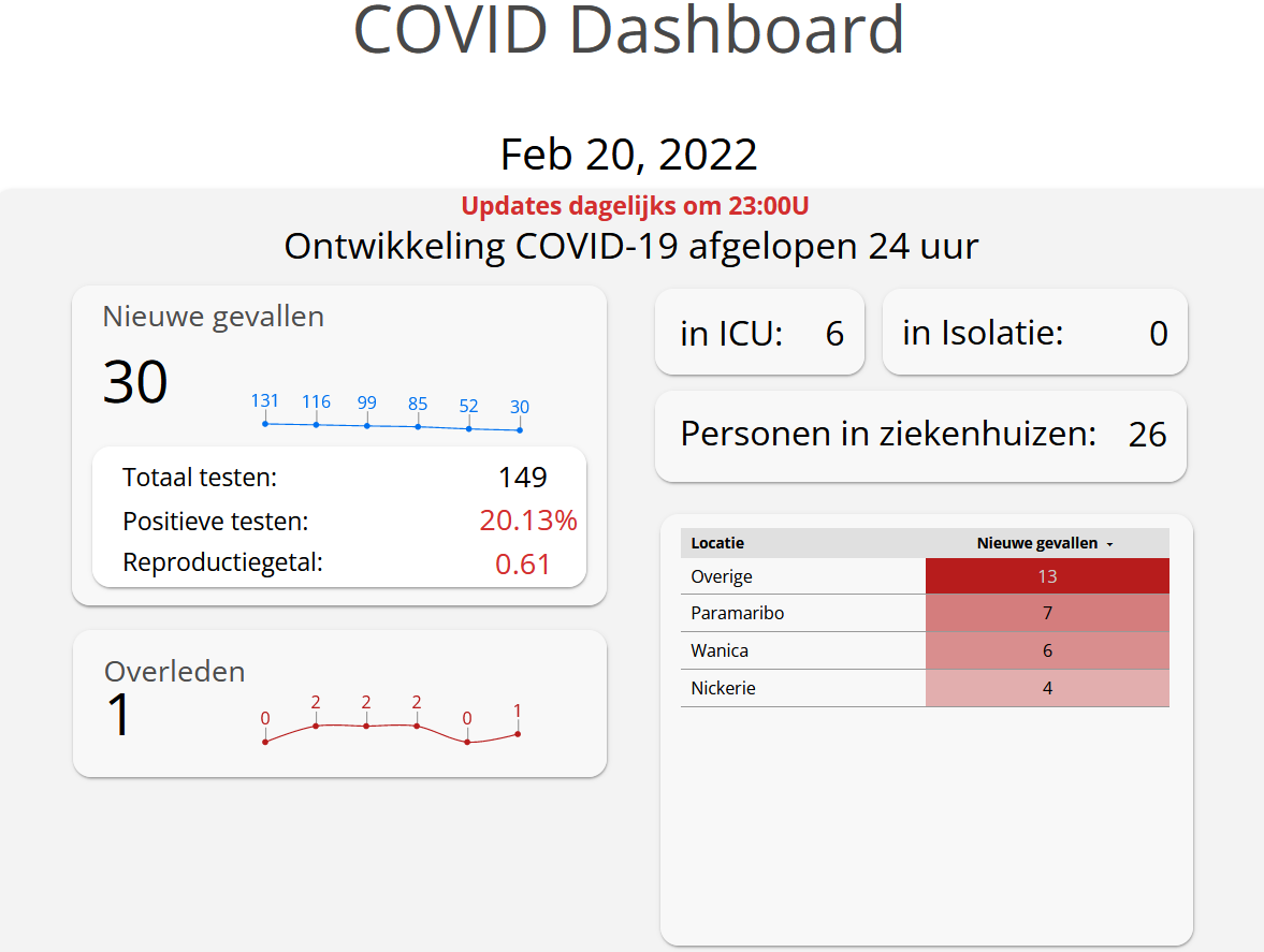 Er zijn zondag 30 nieuwe besmettingen genoteerd binnen 24 uur. Dat geeft het Covid-19 dashboard aan. Behalve de nieuwe besmettingen is er ook 1 persoon overleden aan de gevolgen van Covid-19. Momenteel bevinden 26 personen zich in ziekenhuizen en zijn 6 personen opgenomen op de Intensive Care Unit.