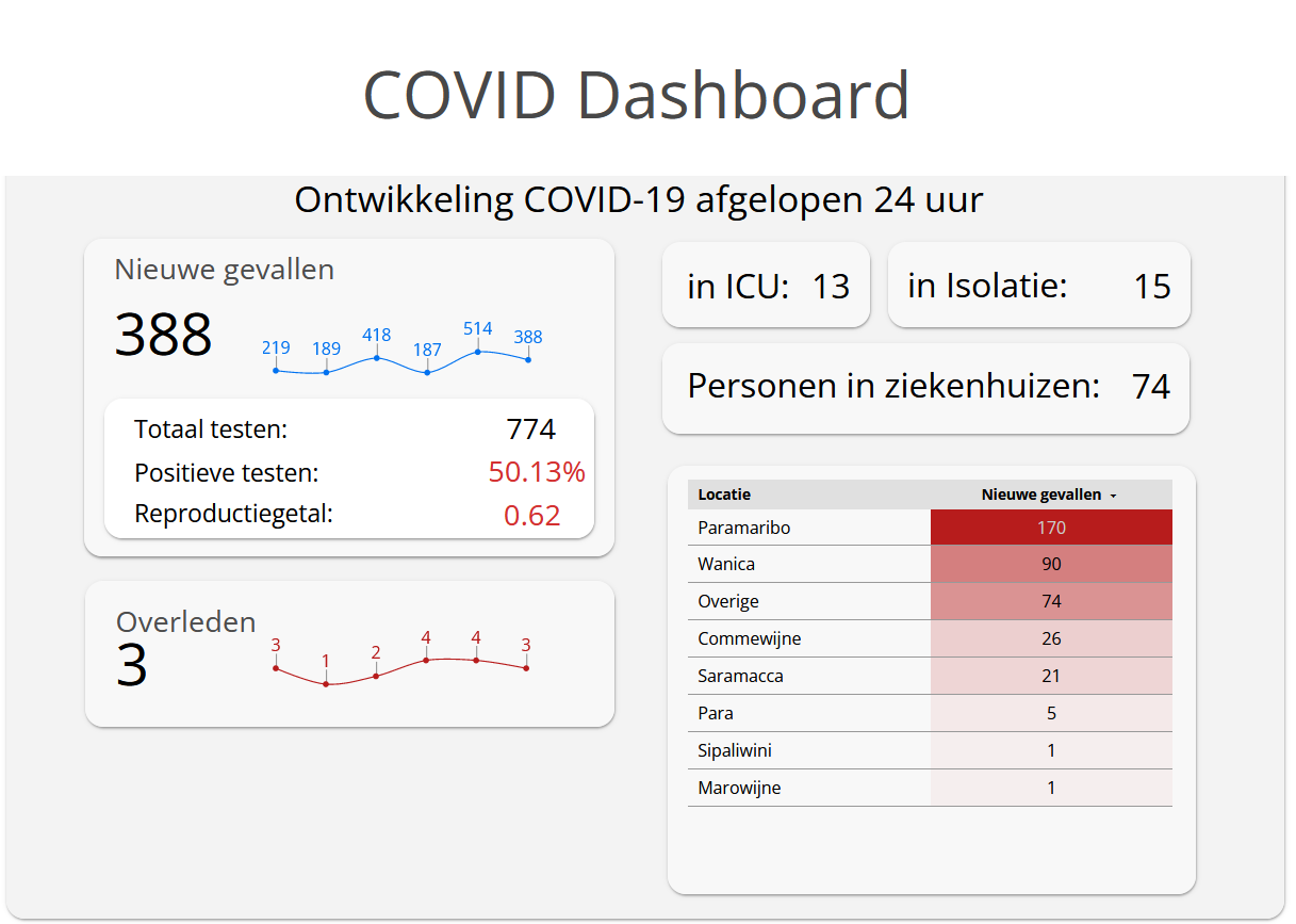 Van de 774 swabs die in de afgelopen 24 uur zijn afgenomen is 50,13% positief getest. Dit komt neer op 388 personen die Covid-19 positief zijn. Het aantal Covid-19 positieven in Suriname is 74.858. Drie patiënten zijn overleden aan de gevolgen van Covid. Het aantal coronadoden staat nu op 1.274. Dit staat aangegeven op het Covid-19 dashboard.