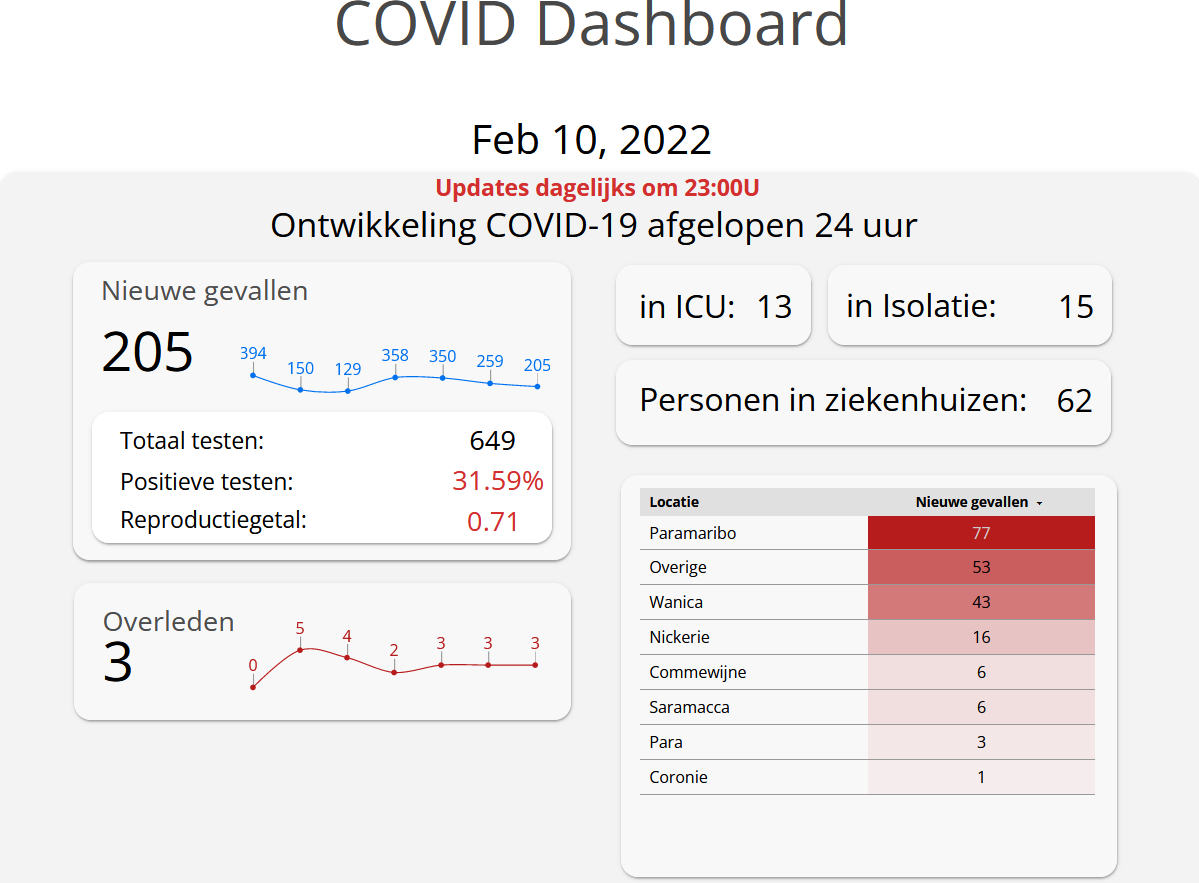 De ontwikkelingen rond Covid-19 in de afgelopen 24 uur zijn dat 31,6% van de 649 afgenomen swabs positief is getest. Dit komt neer op 205 nieuwe positieve gevallen. Het aantal Covid-19-positieven in Suriname is 76,703. Drie patiënten zijn het afgelopen etmaal overleden aan de gevolgen van Covid-19. Het aantal coronadoden staat nu op 1.294. Dit staat donderdagavond aangegeven op het Covid-19 dashboard.