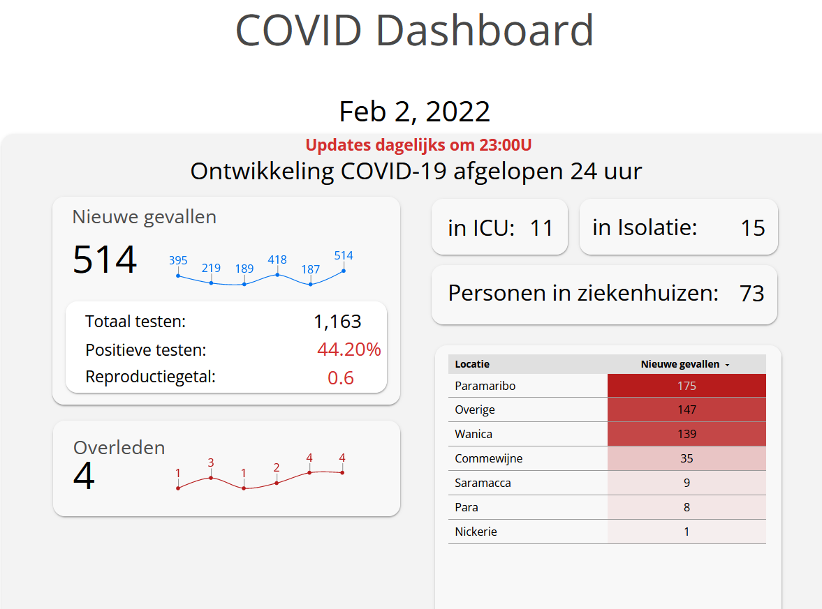 Vier personen zijn in de afgelopen 24 uur overleden aan de gevolgen van Covid-19. Dit brengt het totaal aantal coronadoden in Suriname op 1.271 in Suriname. Van het Covid dashboard valt af te lezen dat er 514 nieuwe positieve gevallen zijn. Dit komt neer op 44,20% van de 1,163 swabs die bij personen zijn afgenomen.