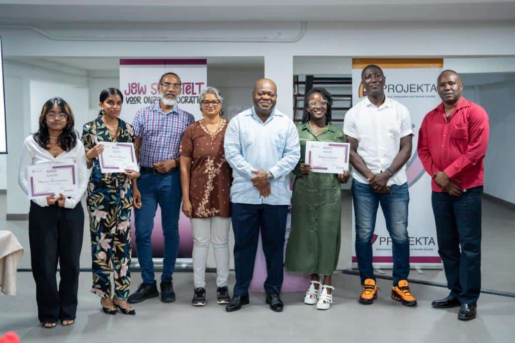 De online competitie ‘Jouw Stem Telt voor Onze Democratie’, georganiseerd door Stichting Projekta, heeft op maandag 19 februari haar winnaars gehuldigd in het nieuwe gebouw van De Nationale Assemblee (DNA). Tijdens de feestelijke ceremonie werd Shamille Verdies de grote winnaar met vier prijzen, waaronder de hoofdprijs voor zijn voordracht ‘An Ideal World’.