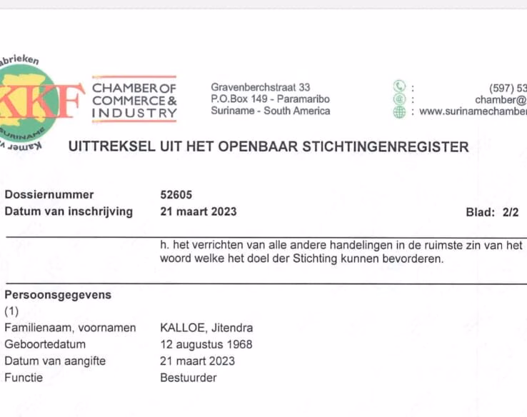 Jones heeft bewijzen dat de directeur op 17 maart 2023 een stichting, genaamd Stichting Kalloe’s Mechanische Productiebedrijf, heeft opgericht en in november heeft hij een aanvraag van 1000 hectare grond ingediend. “We weten allemaal wat de procedure is, want de directeur moet advies geven voor grondaanvraag.” Dit betekent dat de directeur een advies heeft uitgebracht op zijn eigen aanvraag om dat grond te krijgen. “Is dit geen corruptie? Is dit geen misbruik maken van het systeem ten eigen bate? Hoe anders moet ik dit vertalen.”