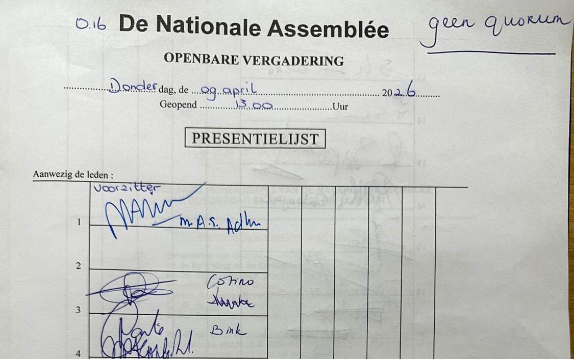 De Nationale Assemblée (DNA) heeft vrijdag verduidelijkt dat PL-fractielid Bronto Somohardjo wel aanwezig was bij de openbare vergadering van donderdag 9 april 2026, die uiteindelijk geen voortgang vond wegens gebrek aan quorum.