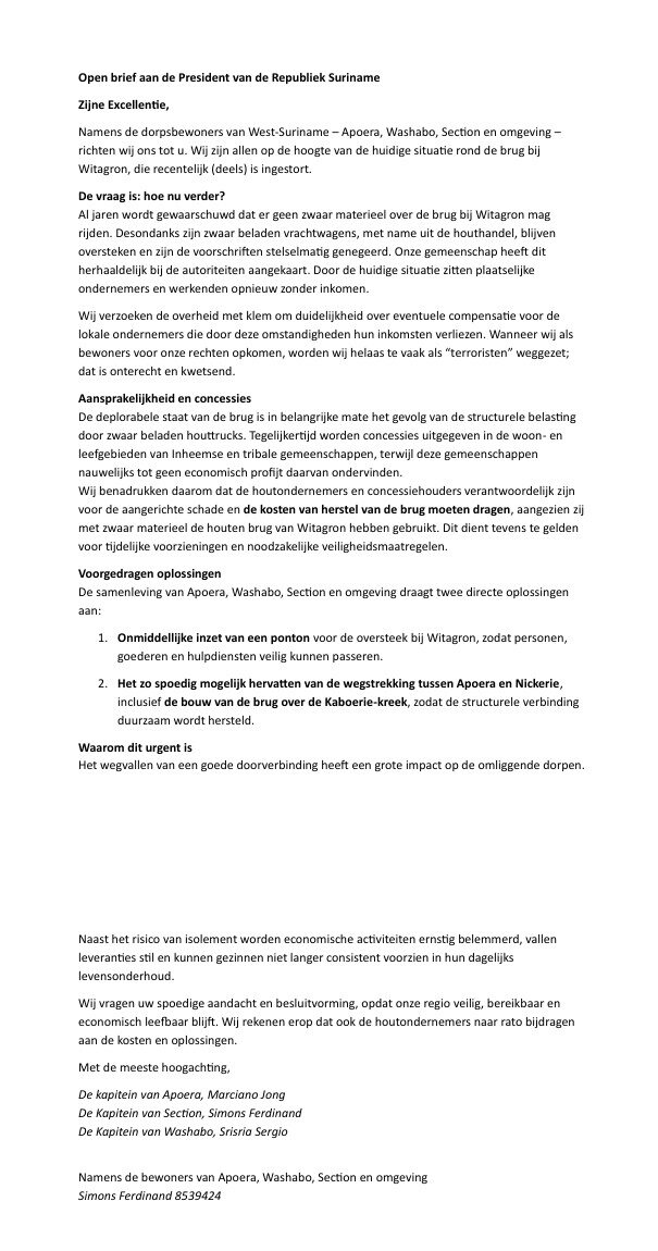 Gemeenschapsleiders uit Apoera, Washabo en Section hebben in een open brief aan president Jennifer Simons om directe maatregelen verzocht na het (gedeeltelijk) instorten van de brug bij Witagron. Zij vragen een tijdelijke pontonoversteek en versnelling van de structurele verbinding met Nickerie.