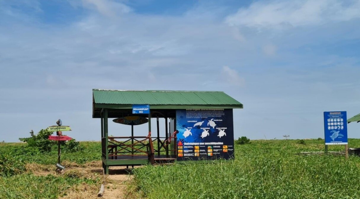 Vanaf het water wordt je verwelkomd door de witte letters die schitteren in het zonlicht, hier moet je zijn: Galibi. Naast de naam staat het nieuw educatiecentrum dat is vormgegeven als een gestileerde zeeschildpad en door de lokale bewoners de liefdevolle naam ‘Kadaru’ heeft gekregen, dat schildpad betekend in Kaliña. Verwijzend naar de gebeeldhouwde Aitkanti en Krapé in het zand met hun neus richting de oceaan, deelt districtssecretaris Edith Awankaroe haar optimistisch gevoel dat deze schildpadden meer soortgenoten zullen gaan aantrekken.