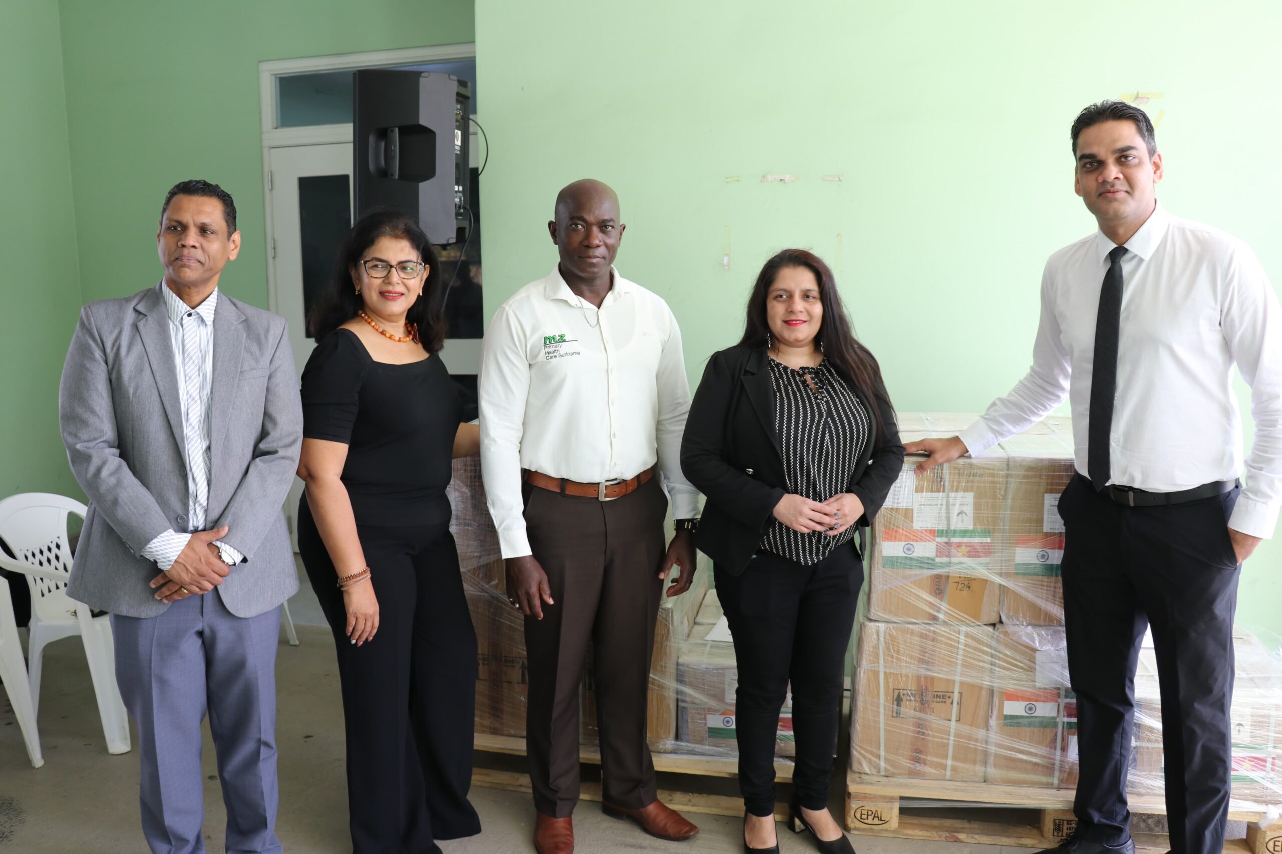 Minister Amar Ramadhin van Volksgezondheid heeft op donderdag 30 november 2023 samen met de directeur van Volksgezondheid, Rakesh Gajadhar Sukul, en de directeur van het Bedrijf Geneesmiddelen Voorziening Suriname (BGVS), Maaltie Sardjoe de symbolische overdracht gedaan van medicamenten afkomstig uit India.