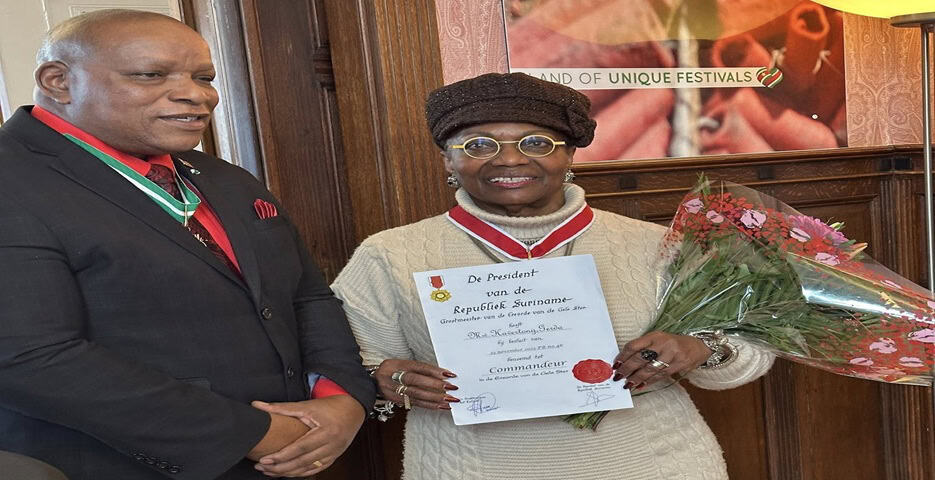 Gerda Lenten-Havertong is eerder deze week in Nederland gedecoreerd met de onderscheiding Commandeur Ere-Orde van de Gele Ster. De decoratie werd haar toegekend door president Jennifer Simons en opgespeld door de Surinaamse ambassadeur in Nederland, Ricardo Panka.