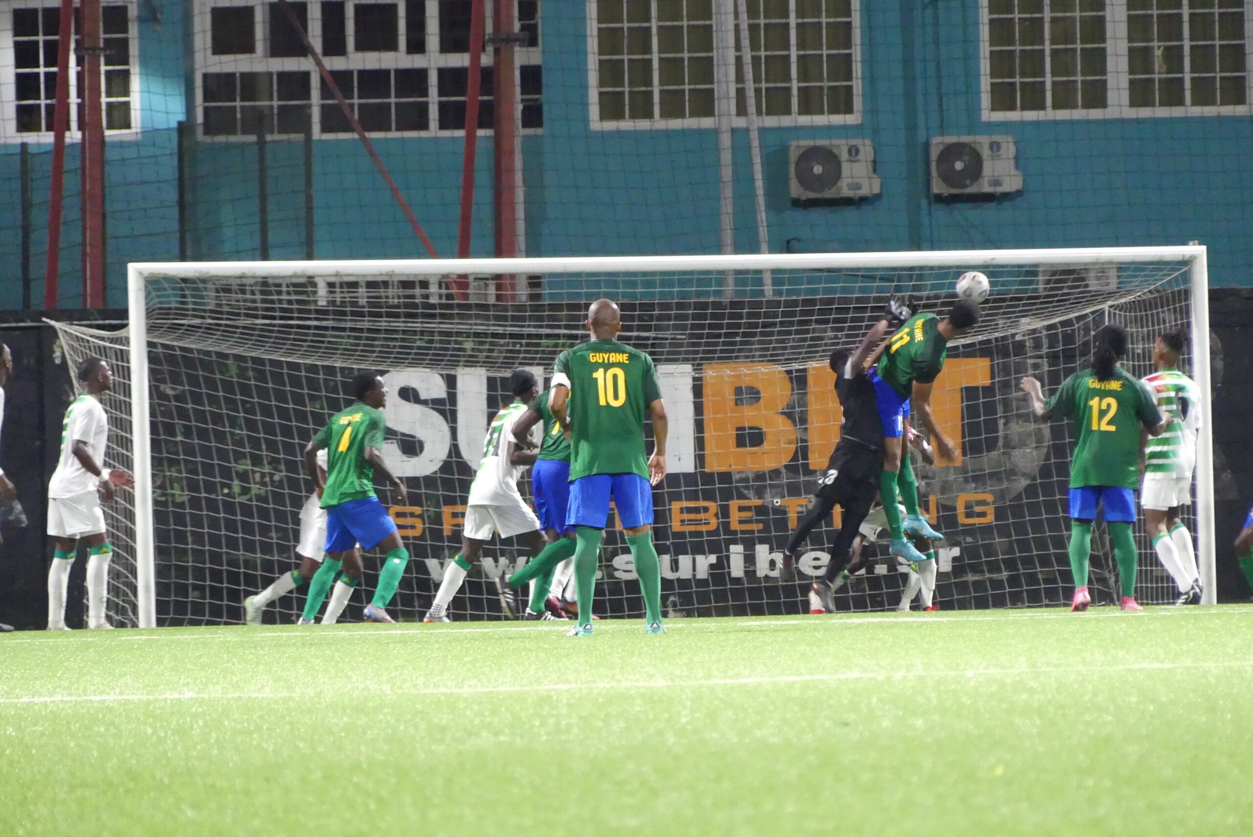 Foto bijschrift: Frans-Guyana scoort hier zijn tweede doelpunt in de oefeninterland tegen Natio, in het Franklin Essed Stadion, zaterdag 19 november. Suriname scoorde eerst, maar verloor uiteindelijk met 1-3. Het duel was als voorbereiding op Natio’s deelname aan het 2022 ABCS toernooi op Curaçao.