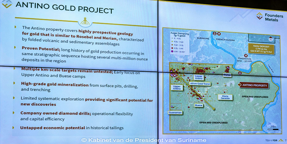 De algemeen directeuren van Nana Resources N.V. en Founders Metals Inc., respectievelijk goudexploratiebedrijven uit Suriname en Canada hebben president Chandrikapersad Santokhi omstandig geïnformeerd over de ontwikkeling van het Antino-goudproject in het Zuidoosten van Suriname.