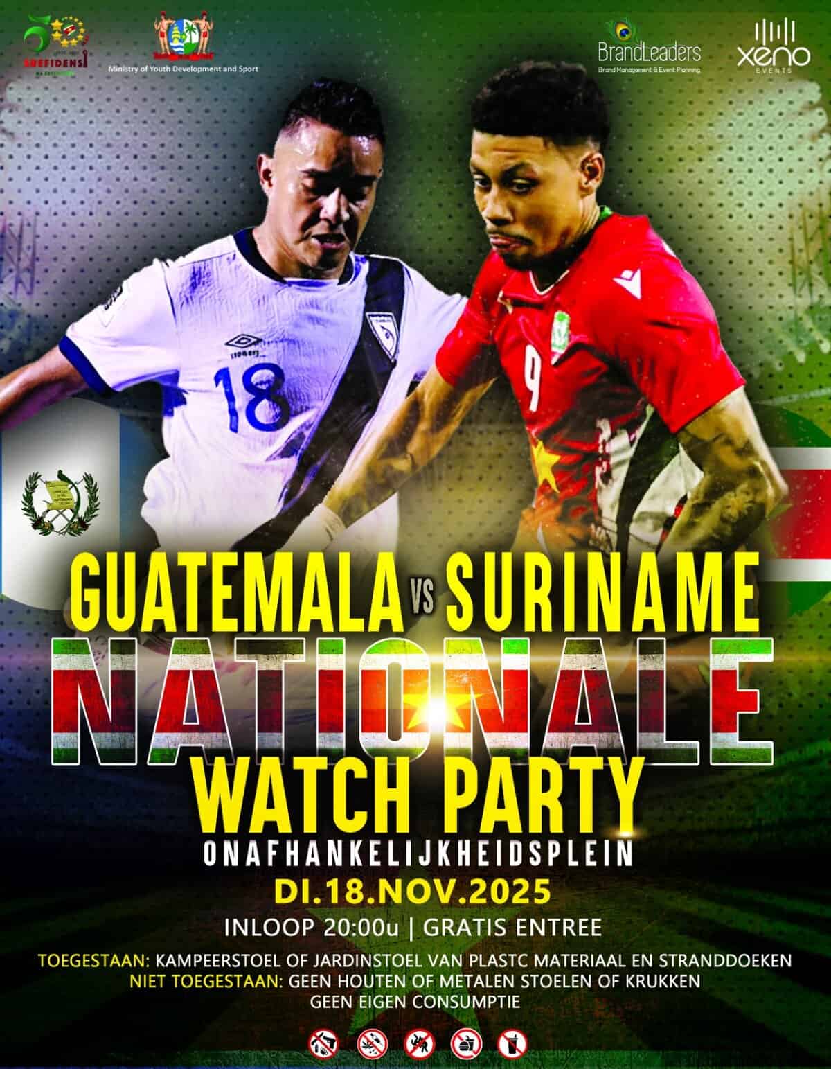 De succesvolle Natio-watchparty in het Nationaal Indoor Stadion krijgt dinsdag een vervolg op het Onafhankelijkheidsplein. Op een groot scherm kunnen supporters de cruciale WK-kwalificatiewedstrijd gratis volgen. Organisatie en overheid benadrukken huisregels en veiligheid.
