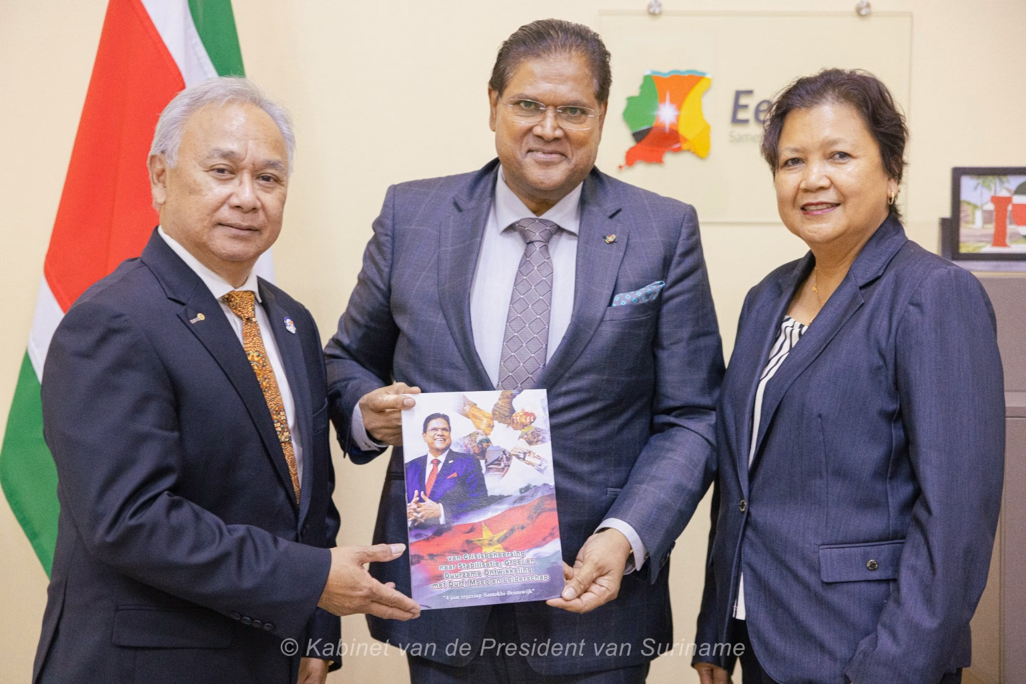 Elwin Atmodimedjo, voorzitter van de Vereniging Herdenking Javaanse Immigratie (VHJI), en Maureen Badjoeri, lid van de commissie, waren aanwezig om het staatshoofd te informeren over de plannen en activiteiten rond de viering van 135 jaar Javaanse Immigratie in Suriname.