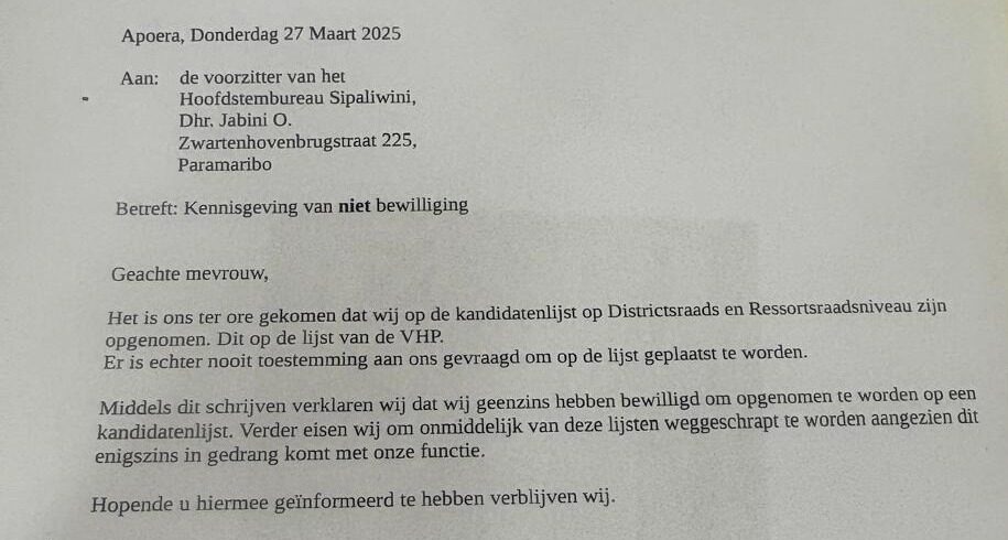 In een formele brief, gedateerd op donderdag 27 maart 2025 en gericht aan het Hoofdstembureau Sipaliwini, verklaren zeven ondertekenaars uit Apoera dat zij nooit toestemming hebben gegeven voor hun opname op de VHP-lijst. Het betreft: Ramdyal Vanek, Mac-Intosh Anja, Sabajo Cheniva, Bronne Luciano, Morishi Selindia en Edwards Adelaide.