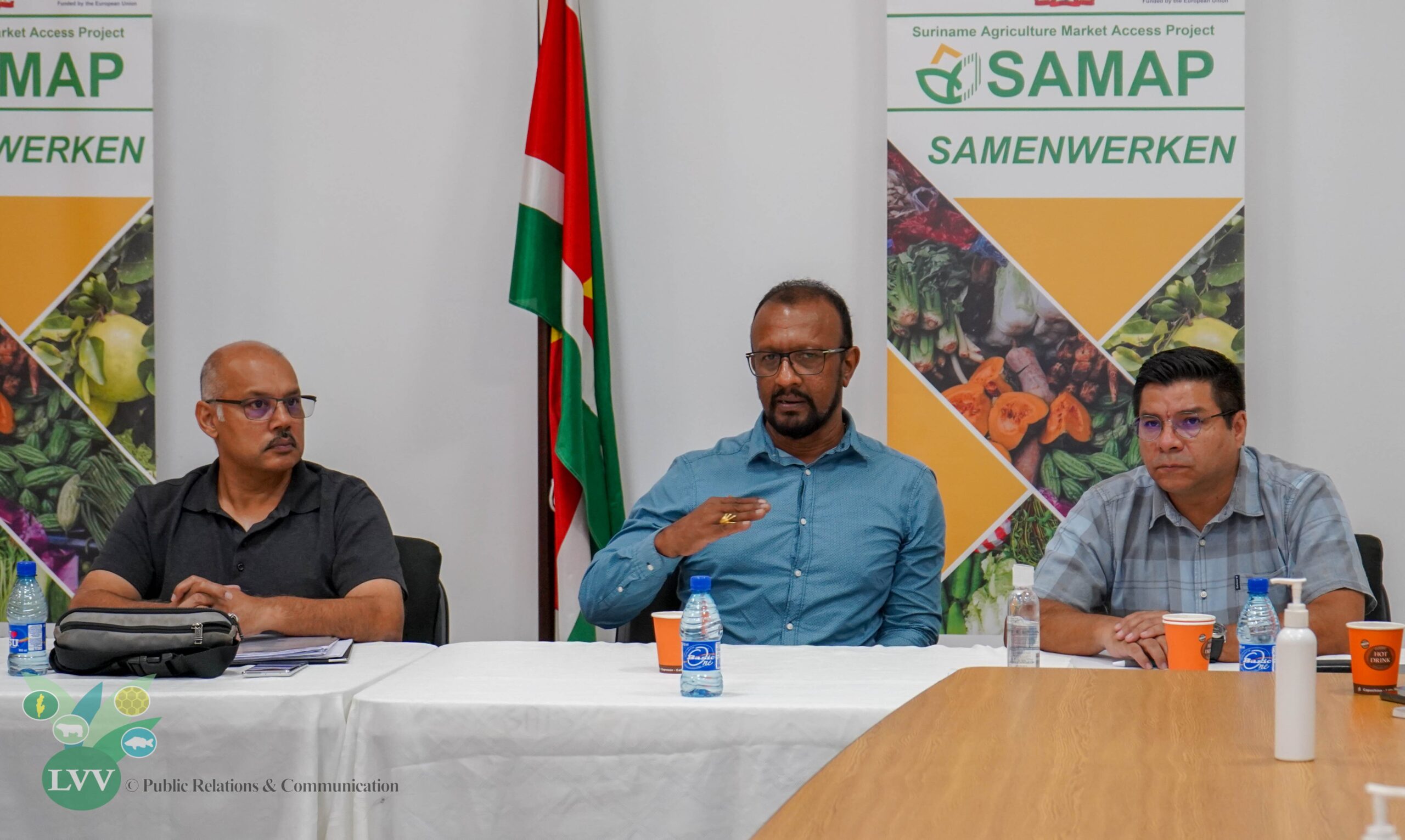 Soedeshchand Jairam, Landbouwdirecteur van het ministerie van Landbouw, Veeteelt en Visserij (LVV) en de Steering Committee van het Cassave Waardeketen Platform, onder leiding van Jerry Sewberath Misser, kwamen bij elkaar voor informatie- en kennisuitwisseling.