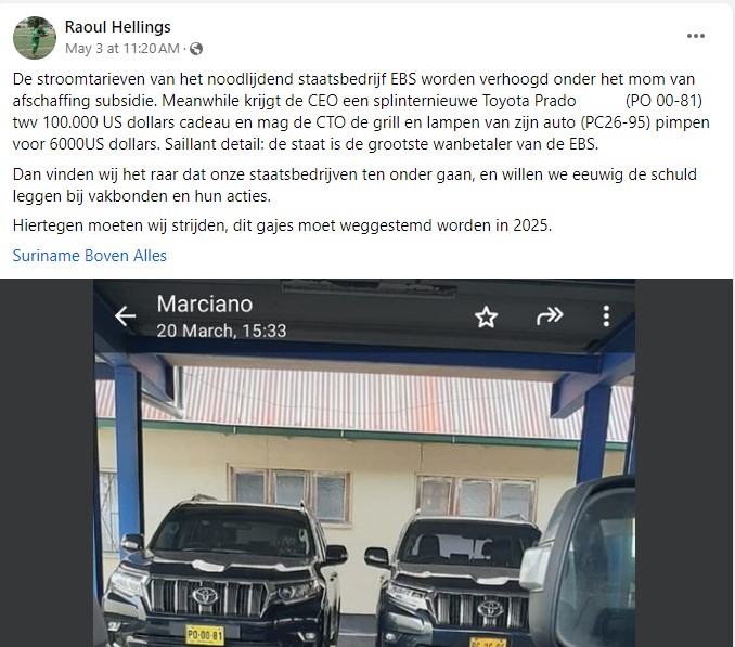 De directie is van mening dat Hellings foto’s zou hebben gemaakt van de auto van de CEO van de EBS en deze zou hebben gedeeld met zijn broer Raoul Hellings. Vervolgens deelde hij deze op Facebook en schreef de broer dat de CEO een splinternieuwe Prado ter waarde van USD 100.000 cadeau heeft gehad en mag de CTO van de EBS de grill en lampen van zijn auto verfraaien voor USD 6000.