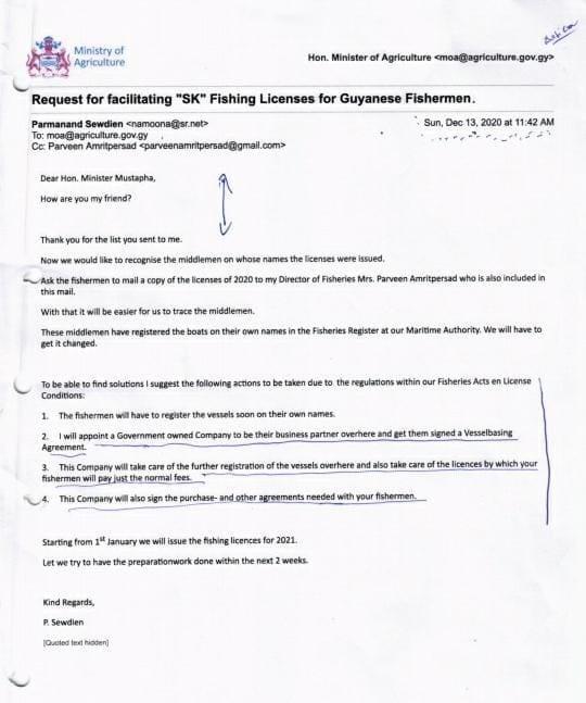 In die correspondentie stond dat de Surinaamse overheid vanaf januari 2021 visvergunningen zal afgeven aan Guyana. Sewdien stelde zelfs voor om een overheidsbedrijf op te richten om op te treden als zakenpartner voor Guyanese vissers en om de ondertekening van een “vesselbasing” -overeenkomst te vergemakkelijken om het proces te vereenvoudigen.