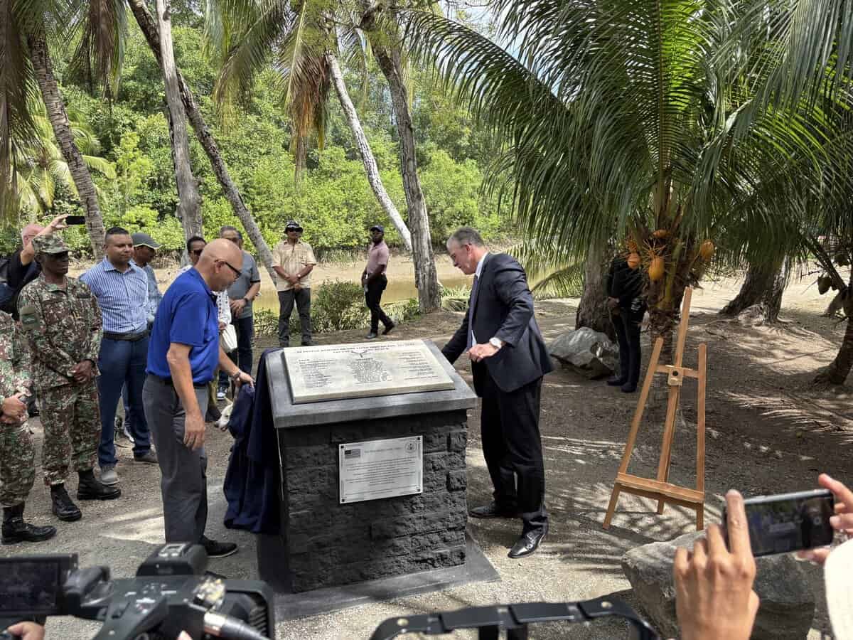 Het stuk is onthuld door Robert Faucher, die binnenkort afzwaait als ambassadeur voor de Verenigde Staten van Amerika in Suriname, en minister Dirk Currie van Onderwijs, Wetenschap en Cultuur. Gisteren was de laatste dag dienend als ambassadeur en vandaag is zijn laatste dag op kantoor, verneemt de redactie.
