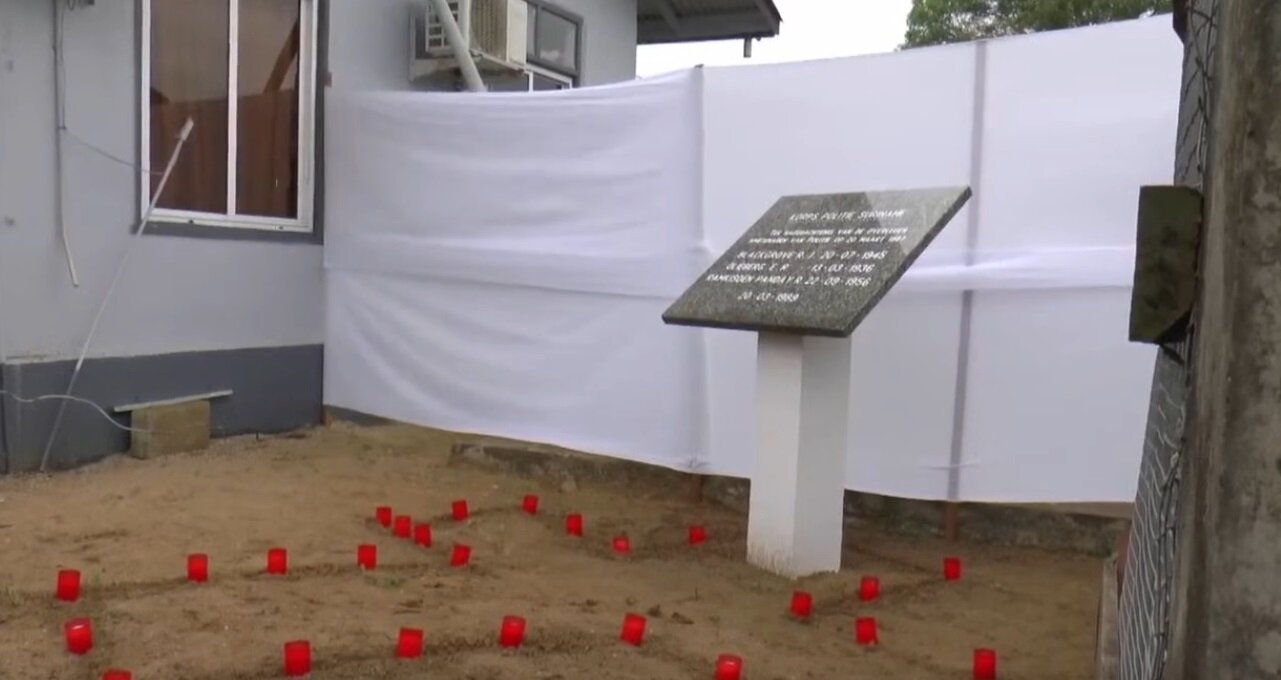 Het was zondag, 20 maart, precies 35 jaar geleden dat drie politiemannen van politiepost Tamanredjo op lafhartige wijze werden neergeschoten. Het gaat om brigadier Eugene Olieberg, inspecteur Jules Ronald John Blagrove en agent Rabindre Ramkisoen Panday. De families van deze mannen hebben na 3,5 decennia nog geen gerechtigheid. Daarom werden er zondag bij dit station bloemen gelegd bij een gedenkplaat bij dit station ter nagedachtenis van deze politiemannen door de nabestaanden en de Stichting 8 December 1982.