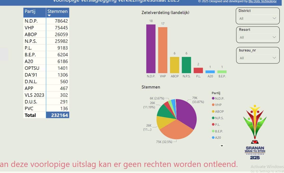 Volgens de voorlopige resultaten die zijn vrijgegeven via het verkiezingsdashboard van het Ministerie van Binnenlandse Zaken, is de NDP (Nationale Democratische Partij) met een minimale voorsprong de grootste partij geworden bij de verkiezingen van 2025. De VHP (Vooruitstrevende Hervormings Partij) eindigt als tweede, terwijl ABOP en NPS beiden zes zetels behalen.