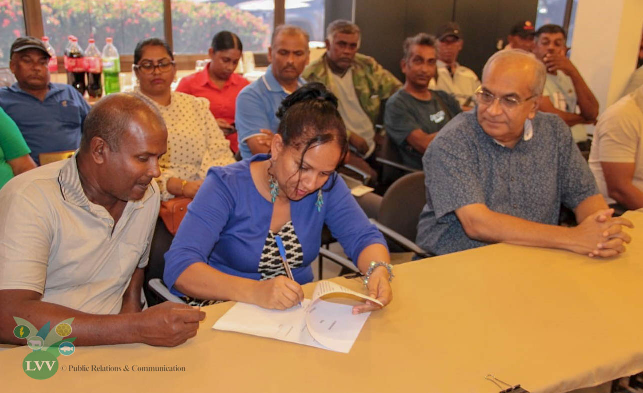 De belanghebbenden hebben hun overeenkomsten getekend met de voorzitter van de agri-coöperatie Shaktimaan, Jamilah Salarbax onder het toeziend oog van minister Parmanand Sewdien van Landbouw, Veeteelt en Visserij (LVV). Deze boeren zullen de komende tijd in de gelegenheid worden gesteld om groenten en fruit op een professionele manier te verbouwen met ondersteuning van het ministerie van LVV.