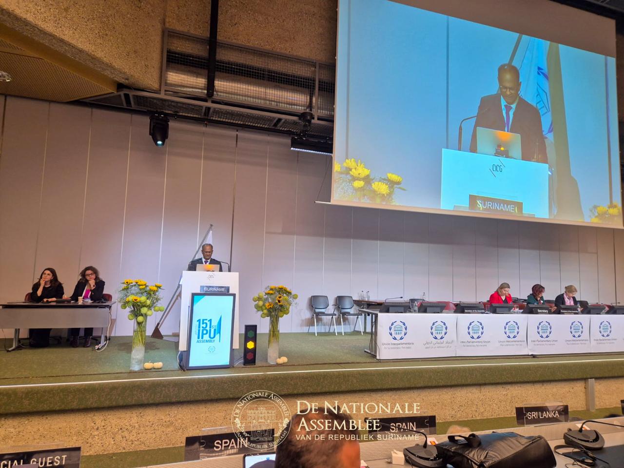 Suriname draagt humanitaire waarden uit in woord én daad, zei drs. Rabindre Parmessar op 20 oktober 2025 tijdens de 151ste Algemene Vergadering van de Interparlementaire Unie (IPU) in Genève. Hij riep op tot versterking van dialoog, waardigheid en inclusie wereldwijd.