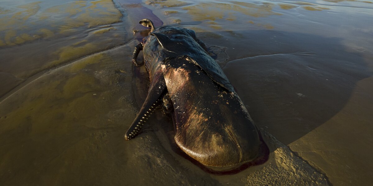 Net boven het karkas vliegen er enkele aasgieren rond die zich klaarmaken voor een walvissen-maaltijd. “Het gaat om een potvis, een van de 19 walvissoorten die we voor de kust van ons land tegenkomen”, zegt Pool. Ze schat dat het dier al enige tijd daar ligt, omdat het al in staat van ontbinding verkeert. “Kijk, hier op de beelden zie je de penis van de walvis, door de gassen bij de ontbinding is die uit zijn lichaam gestoten. Je ziet ook dat er enkele scheuren zijn aan het beest”, zegt Pool terwijl ze naar de dronebeelden wijst.