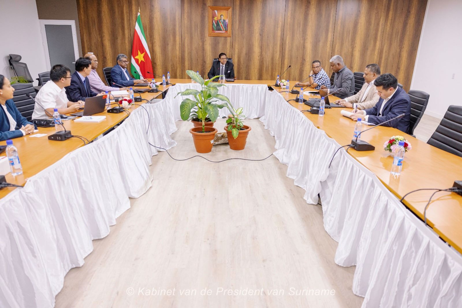 President Chandrikapersad Santokhi heeft op dinsdag 2 april 2024 de gesprekken met de delegatie van het Chinees staatsbedrijf Power Construction Corporation of China, meer bekend als Power China, voortgezet.