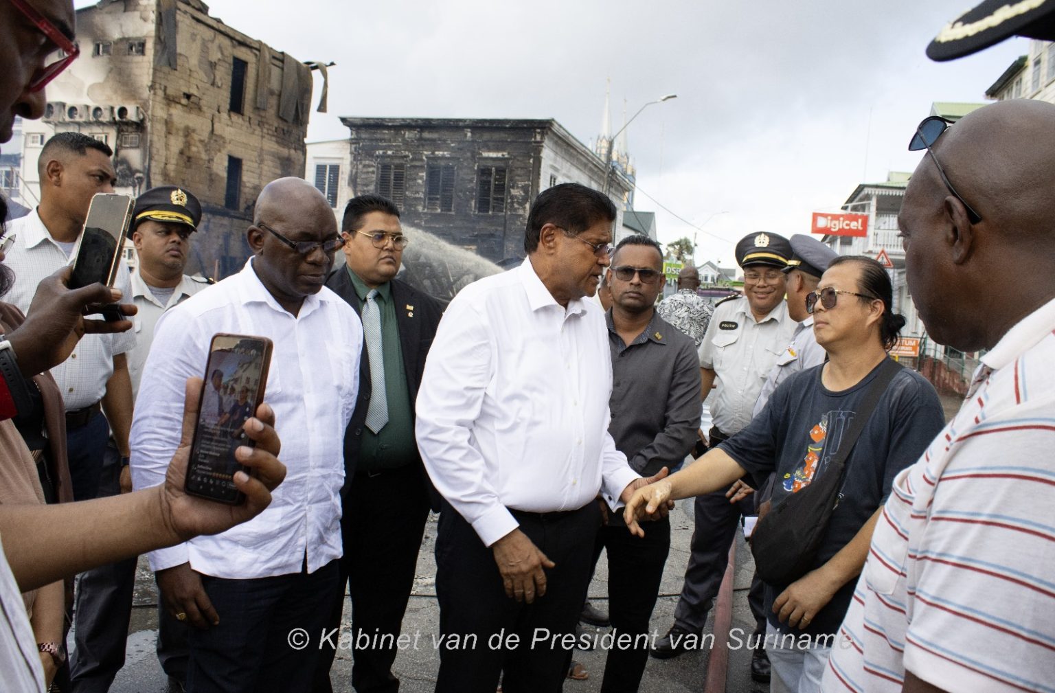 President Chandrikapersad Santokhi heeft zich vandaag nog georiënteerd bij de panden aan de Henck Arronstraat, waar een verwoestende brand meerdere gebouwen in de as heeft gelegd.