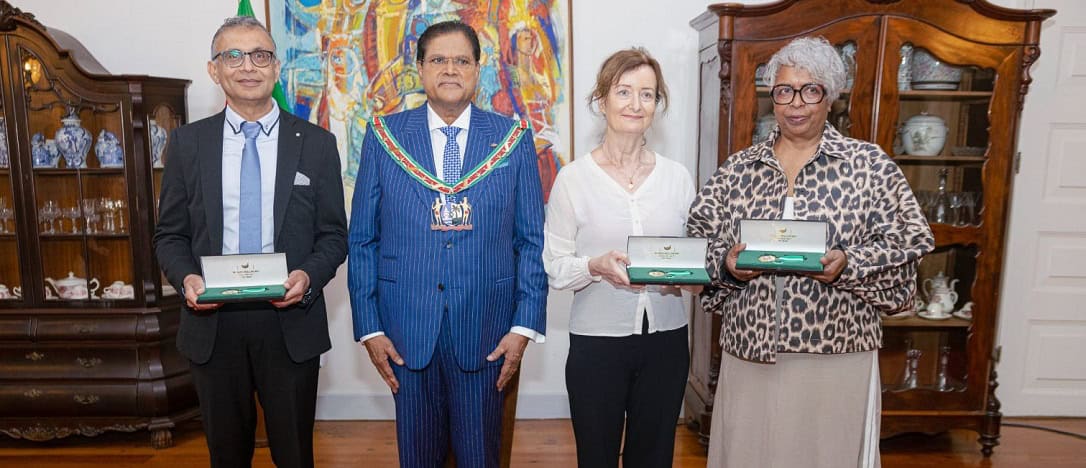 Tijdens een plechtigheid op vrijdag 11 april 2025 in het Presidentieel Paleis, zijn drie leden van de niertransplantatiemissie in Suriname onderscheiden met de titel Ridder in de Ereorde van de Palm.
