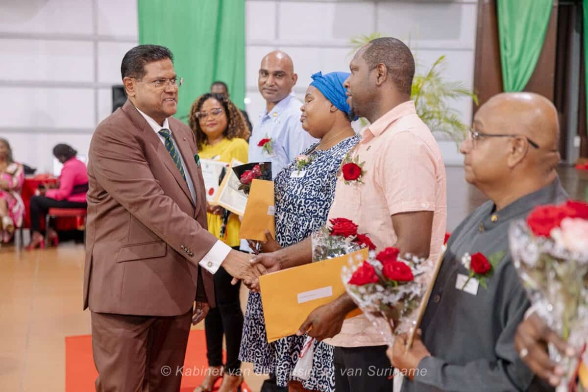 President Santokhi sprak de aanwezigen persoonlijk toe en benadrukte het belang van erkenning en dankbaarheid. “Misschien leeft nog steeds het gevoel dat u ongemerkt bent voorbijgegaan in al die momenten waarop u kracht heeft gegeven aan land, volk en kabinet. Vandaag is een moment van ‘gran tangi’,” zei het staatshoofd.