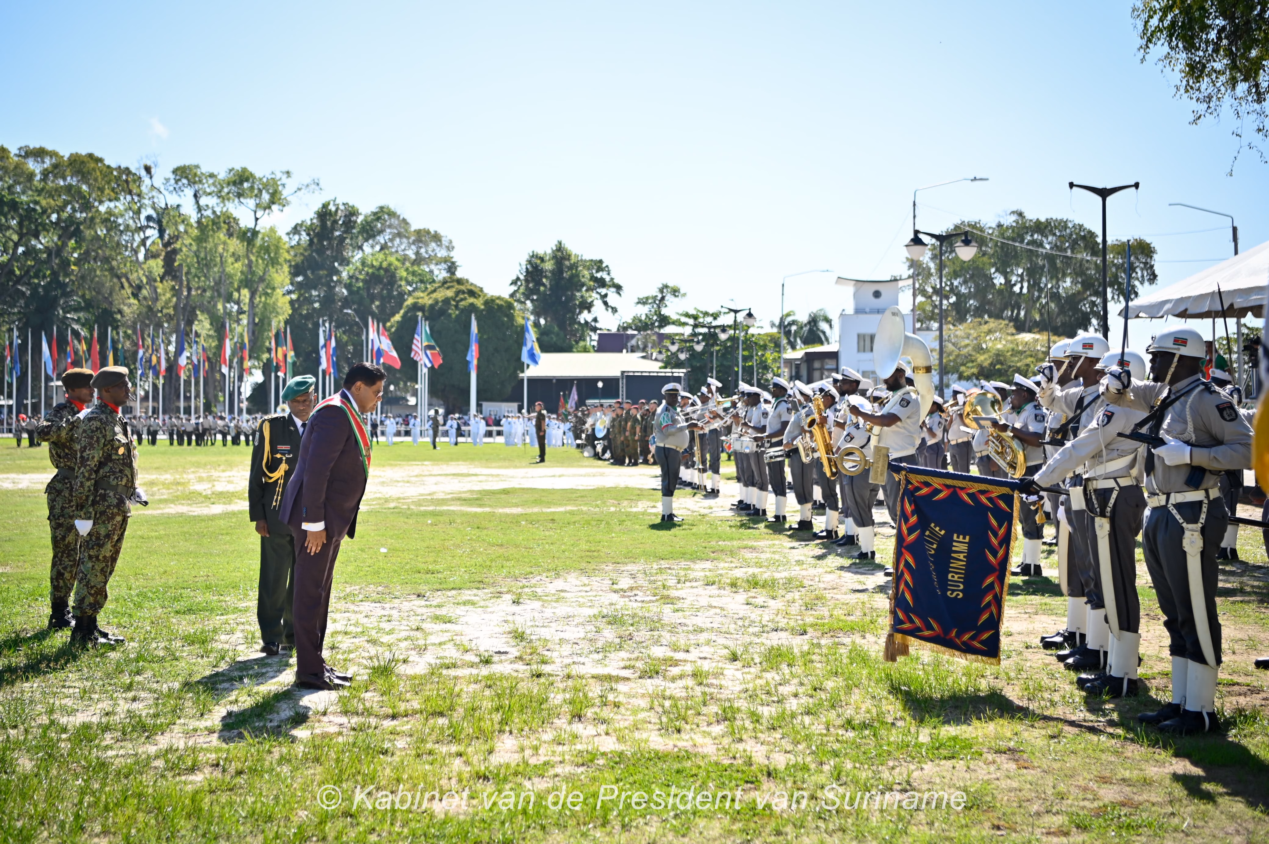 De viering begon met een saluut van 21-minuutschoten. Naast president Santokhi begroetten ook kolonel Werner Kioe A Sen, bevelhebber van het Nationaal Leger, en politiechef Bryan Isaacs de troepen ceremonieel. Voorafgaand aan de inspectie bracht het staatshoofd eer aan het vaandel van de Surinaamse krijgsmacht.