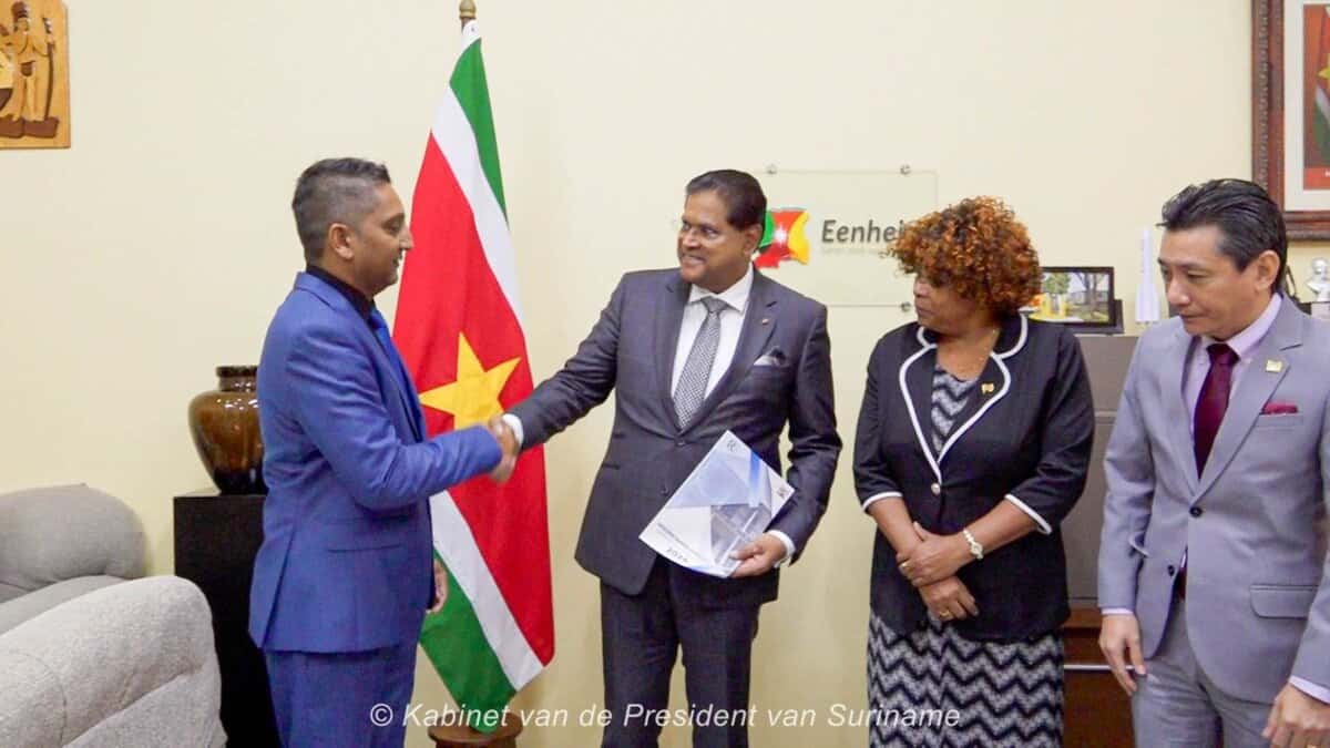 President Chandrikapersad Santokhi heeft op vrijdag 28 maart 2025 het Rekenkamerverslag over het dienstjaar 2024 in ontvangst genomen. De overhandiging vond plaats op het kabinet van de president.