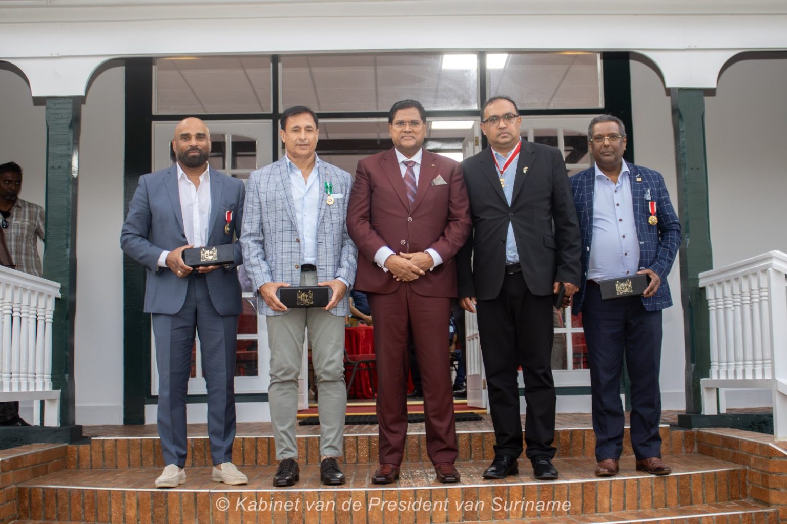 President Santokhi overhandigde de versierselen aan Ramon Ramsodit die gedecoreerd wordt tot Commandeur in de Ereorde van de Gele Ster. Soerindrakumar Malhoe werd versierd in Officier in de Ereorde van de Palm en Mohamed Habib en Dajanand Lachman namen de Ridders in de Ereorde van de Gele Ster onderscheiding in ontvangst.