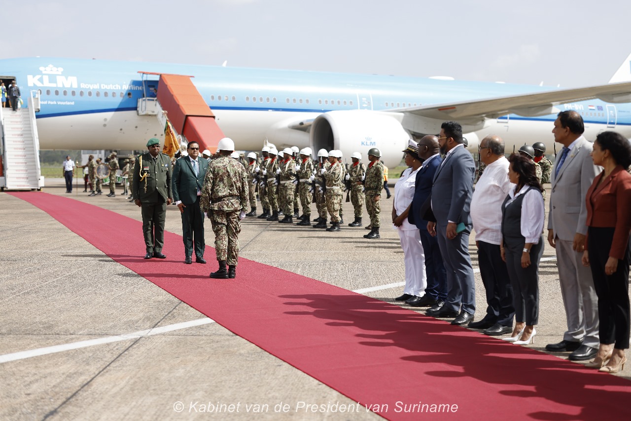 President Chandrikapersad Santokhi is na een vruchtbaar bezoek aan China in de middag van 20 april 2024 in Suriname gearriveerd. Op de Johan Adolf Pengel Luchthaven werd het staatshoofd met militair eerbetoon ontvangen.