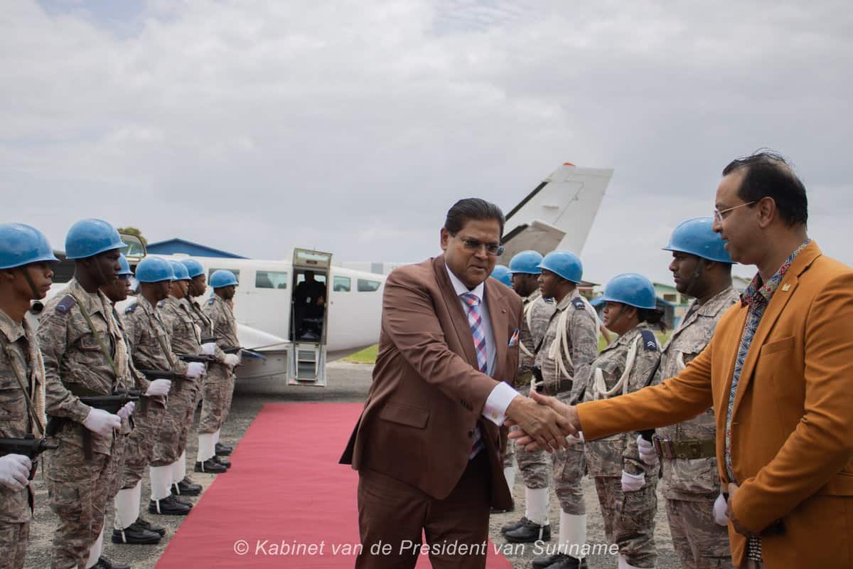 President Chandrikapersad Santokhi is vrijdagmiddag 21 februari teruggekeerd in Suriname na zijn deelname aan de 48ste Caricom Staatshoofden Vergadering in Bridgetown, Barbados. Bij aankomst op het vliegveld Zorg en Hoop werd hij verwelkomd door onder anderen minister Riad Nurmohamed van Openbare Werken.