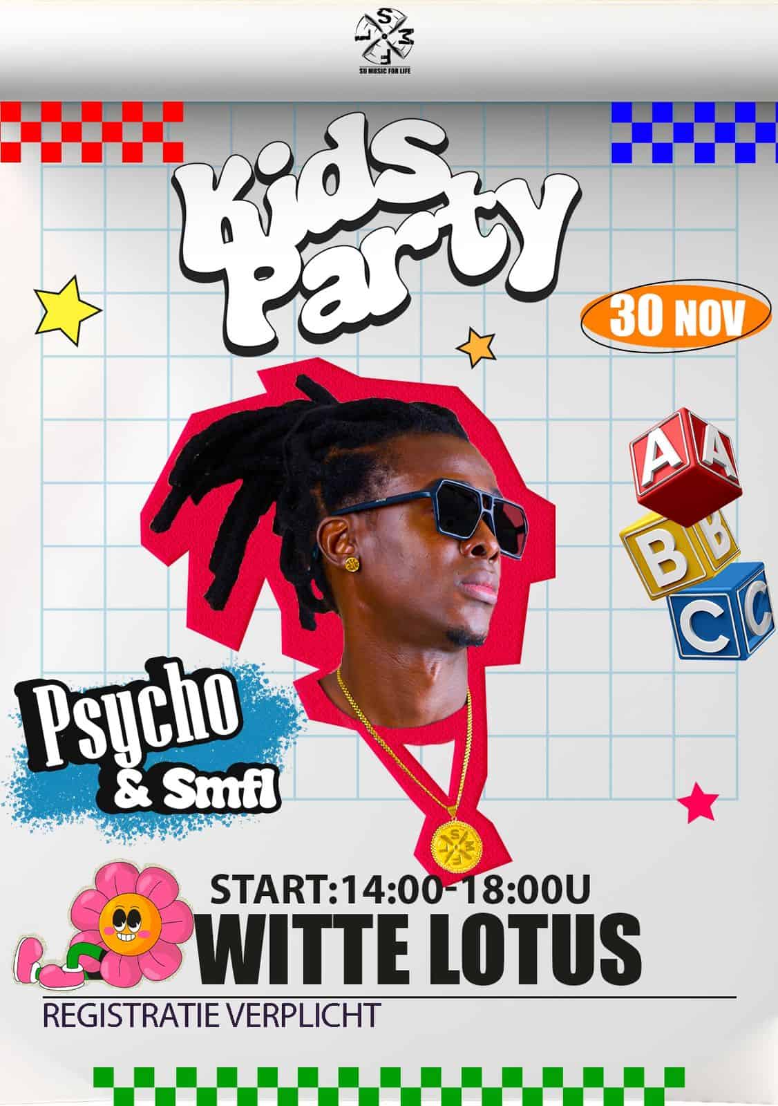 Over enkele dagen verandert evenementen locatie Witte Lotus in een vrolijk kinderspektakel. Op zaterdag 30 november organiseert artiest Psycho, samen met zijn organisatie SMFL, de derde editie van de Psycho Kids Party, een gratis middag speciaal voor kinderen tot en met 14 jaar. Het programma duurt van 14:00 tot 18:00. Registratie was verplicht en is inmiddels gesloten omdat de beschikbare plekken zijn bereikt.
