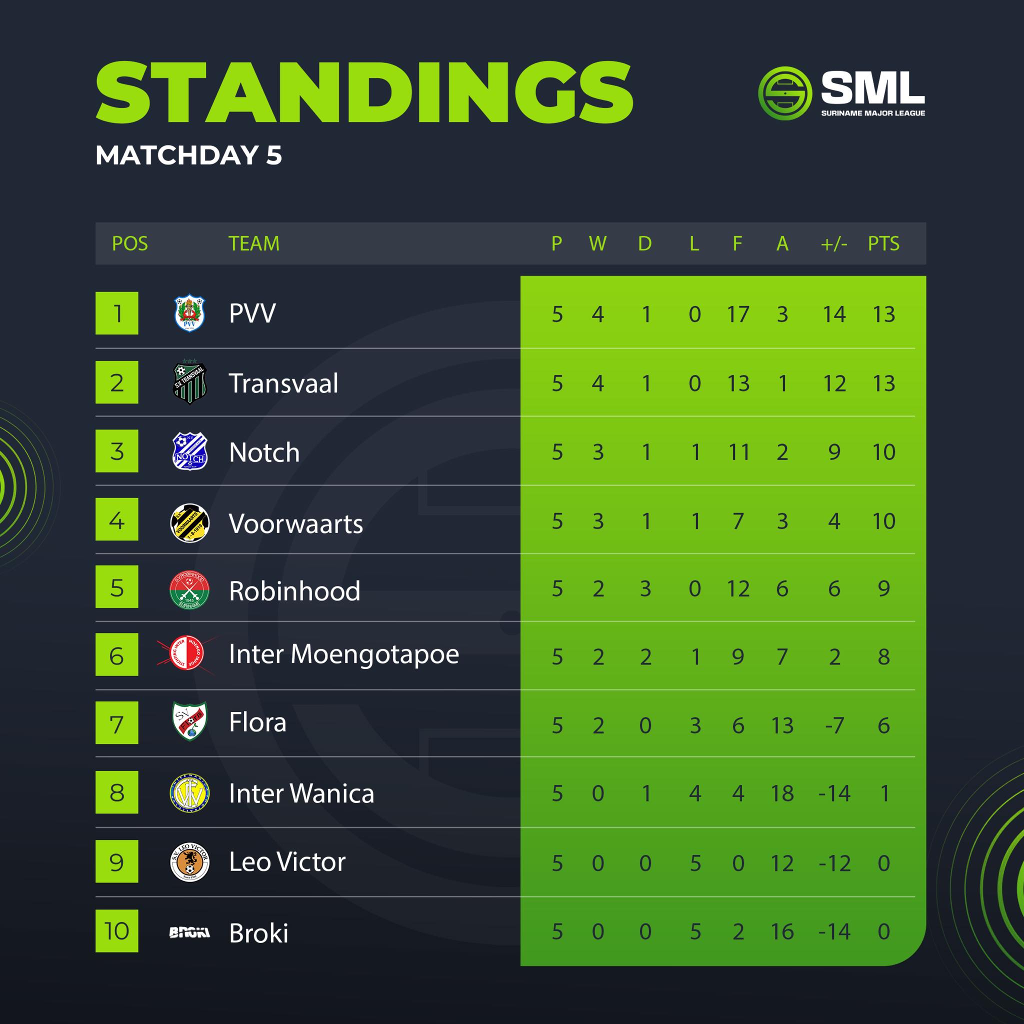Mede door bovengenoemde uitslagen gaan PVV en Transvaal nu elk met 13 punten aan de leiding. PVV heeft echter een beter doelsaldo van +14 ten opzichte van Transvaal (+12). Notch klom over Voorwaarts naar de derde plek en heeft nu ook 10 punten. De Moengonese club heeft echter een beter doelsaldo (+9) dan de oudste voetbalvereniging (+4).