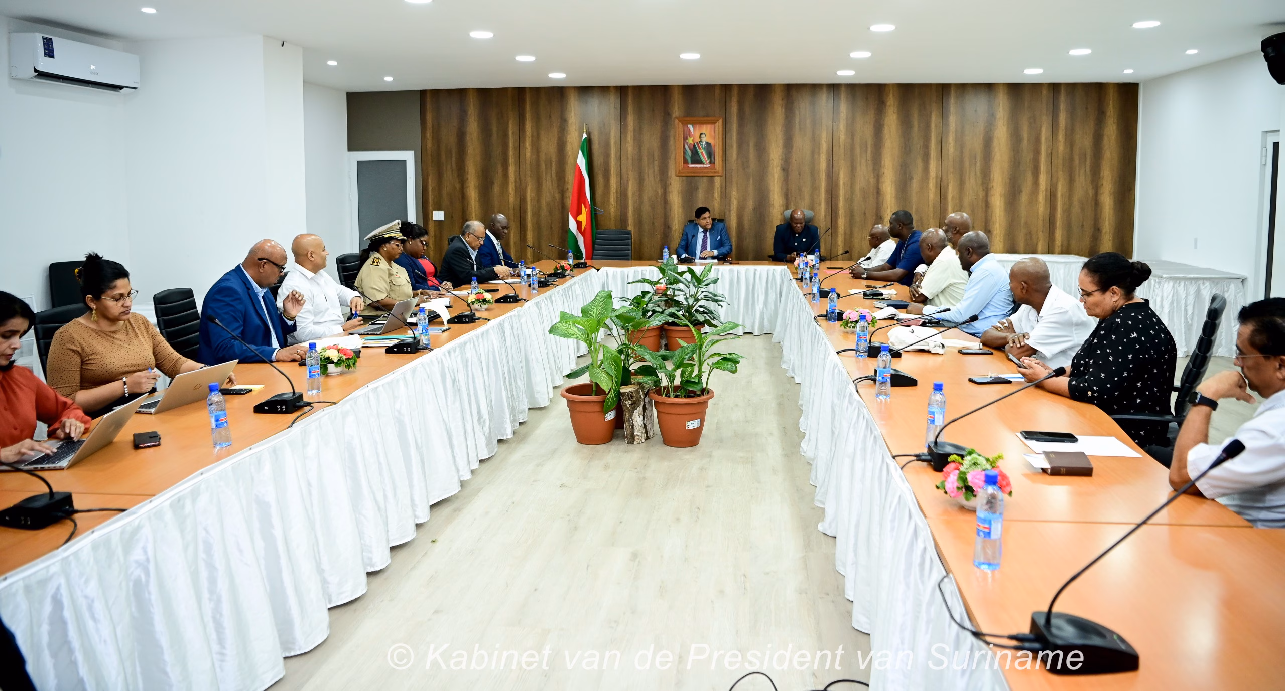 De bespreking op het kabinet van de president werd onder meer gevoerd in aanwezigheid van vice-president Ronny Brunswijk, ministers Kenneth Amoksi van Justitie en Politie, Parmanand Sewdien van Landbouw, Veeteelt en Visserij, Gracia Emanuel van Regionale Ontwikkeling en Sport, districtscommissaris Marlene Joden en het bestuur van de Federatie van de Para plantages.