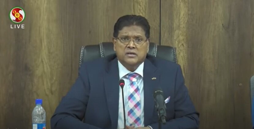 Dat zegt de president Chandrikapersad Santokhi in een statement zojuist. Naast hem zaten de Vicepresident Ronnie Brunswijk, Minister van Defensie Krishna Mathoera en ook Minister van Justitie en Politie, Kenneth Amoksi.