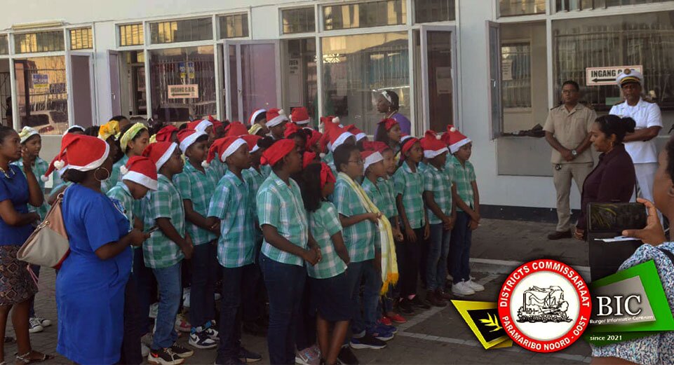 In het kader van het kerstfeest, hebben EBGS scholen een ‘singi prisiri’ activiteit, waarbij zij op diverse openbare plekken kerstliederen zingen en zodoende de boodschap van kerst overbrengen. De districtscommissaris van Paramaribo Noord-Oost Ricardo Bhola en zijn personeel hebben afgelopen vrijdag kunnen genieten van het zangtalent van de kinderen van de Renkewitzschool. “Zingen maakt blij en zo willen we iedereen brengen in de sfeer van kerst”, geeft Hilly Libretto, schoolhoofd van de onderwijsinstelling aan.