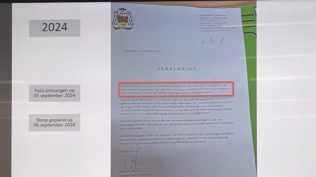 In de brief staat verder dat de leiding van het bisdom noodgedwongen tot het besluit was gekomen, omdat het gebouw een groot risico vormt op ernstige ongelukken, die de dood tot gevolg kunnen hebben voor voorbijgangers en leden van organisaties die panden op het terrein huren. In de brief gaf Choennie aan dat het afbreken een tijdelijke oplossing zou zijn, totdat de fondsen beschikbaar zouden zijn om het poortgebouw in dezelfde historische staat te herbouwen.